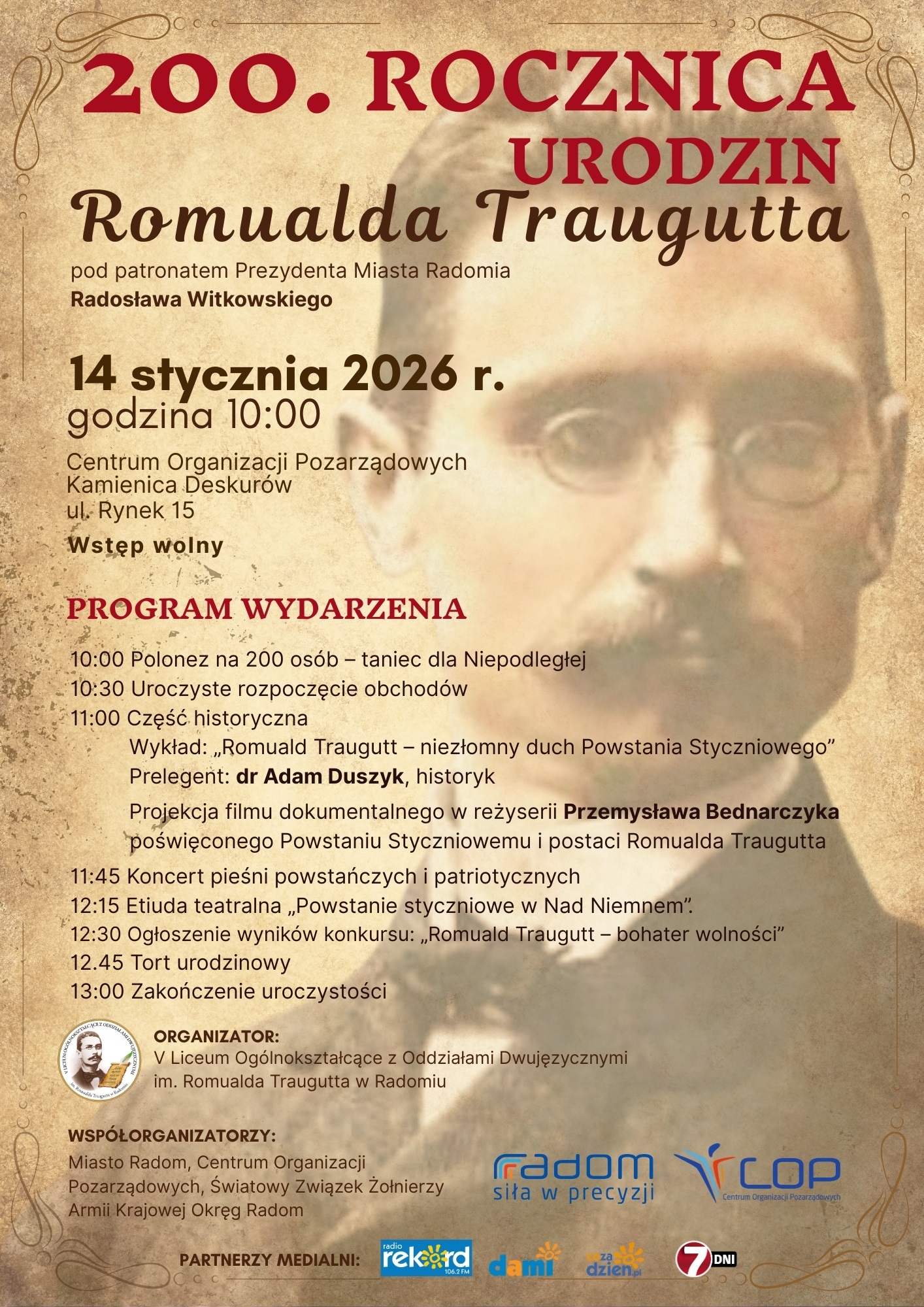 14 stycznia 2026 roku V Liceum Ogólnokształcące z Oddziałami Dwujęzycznymi w Radomiu zaprasza na uroczystość uczczenia 200. rocznicy urodzin bohatera powstania styczniowego Romualda Traugutta.